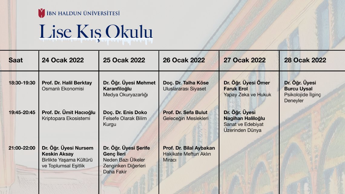 İbn Haldun Üniversitesi Sosyal Bilimler Lise Kış Okulu Programında, akademi dünyasının önde gelen isimlerinden her alana ve disipline dair eğitimler öğrencileri bekliyor. 12 farklı sosyal bilimler bölümü ile ilgili , ilgi çekici konularda seminerlerin yer aldığı program, sınırlı bir kontenjanla 24 – 28 Ocak tarihlerinde online olarak gerçekleştirilecek.